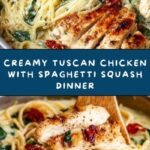 This Tuscan Chicken and Spaghetti Squash recipe offers a creamy, flavorful low-carb alternative to traditional pasta dishes. Tender chicken pieces are cooked in a rich garlic and shallot-infused cream sauce with sun-dried tomatoes and fresh spinach, then combined with roasted or microwaved spaghetti squash for a wholesome and hearty meal perfect for a cozy dinner.