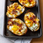 - Bake stuffed potatoes: Place the loaded potato halves on a baking sheet. Bake for 15–20 minutes at 375°F, or until the egg whites are fully set and yolks are cooked to your preference.