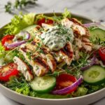 - Dress with Tzatziki: Spoon the prepared tzatziki sauce generously over the salad and chicken, ensuring an even coating of the creamy dressing throughout.