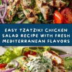 A refreshing and flavorful Tzatziki Chicken Salad featuring juicy cooked chicken, crisp romaine lettuce, tangy olives, pepperoncini peppers, grape tomatoes, and crunchy red onions all tossed with a creamy homemade tzatziki dressing made from Greek yogurt, cucumber, garlic, olive oil, and fresh dill. This no-cook, quick-prep salad is perfect for a light lunch or a healthy dinner.