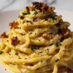 Present your Vegetarian Carbonara Recipe by twirling portions of pasta onto each plate with a fork for an elegant touch. Garnish with a whole sprig of parsley or even edible flowers for a stunning visual appeal. Serving in warm bowls emphasizes the comforting nature of this dish, especially when entertaining guests.