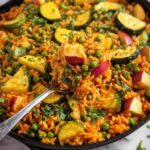 This vibrant Vegetarian Paella recipe features a medley of colorful vegetables, fragrant spices, and protein-rich chickpeas, all cooked together in a traditional paella pan or skillet. With tender rice infused with smoky paprika and saffron, this dish offers an authentic Spanish flavor without using any meat or seafood, making it perfect for vegetarians seeking a hearty and flavorful meal.