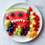 Dice the watermelon flesh you reserved into bite-sized chunks, perfect for snacking. Fill the shark’s open mouth with a vibrant mix of watermelon pieces, green and red grapes, blueberries, and orange segments. This medley represents the shark’s bait, bursting with flavor and color. Around the shark, artfully arrange the remaining fruits—strawberries, kiwi slices, pineapple chunks, cantaloupe, honeydew balls, and blackberries—in alternating colors and shapes. This creates a striking and inviting board that is as pleasing to look at as it is to eat. Don’t forget to scatter gummy fish and mini marshmallows around the display for fun, whimsical accents that mimic aquatic life and bubbles.